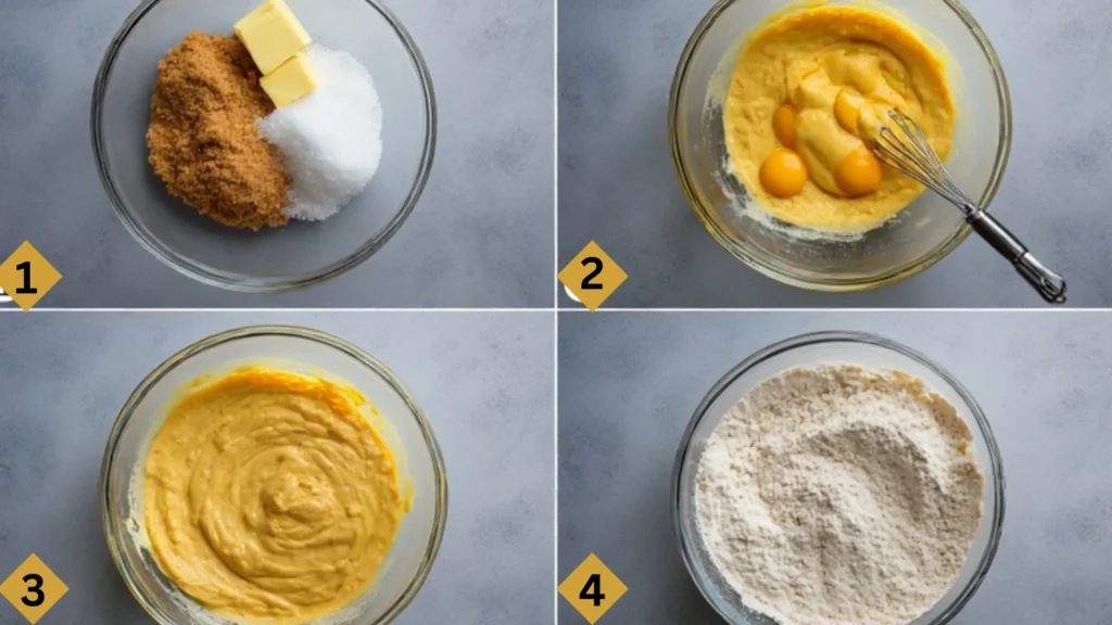 In a large bowl, beat softened butter, granulated sugar, brown sugar, and vanilla until creamy. Whisk for about 2 minutes until the mixture looks smooth and light brown. This step fully dissolves the sugars and mixes them evenly. You are setting the foundation for a perfectly sweet cookie.