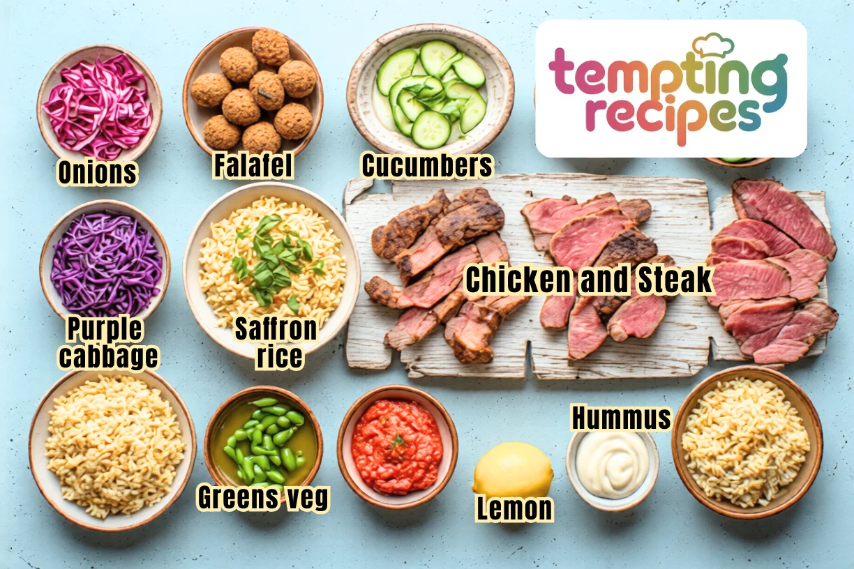 In this recipe, you’ll whip up a bold harissa marinade, cook fluffy saffron rice, sear the steak and chicken to perfection, and bake crispy falafel. It serves four, so it’s great for family meals or meal prep. Each bite mixes spice, crunch, and freshness in the best way.
