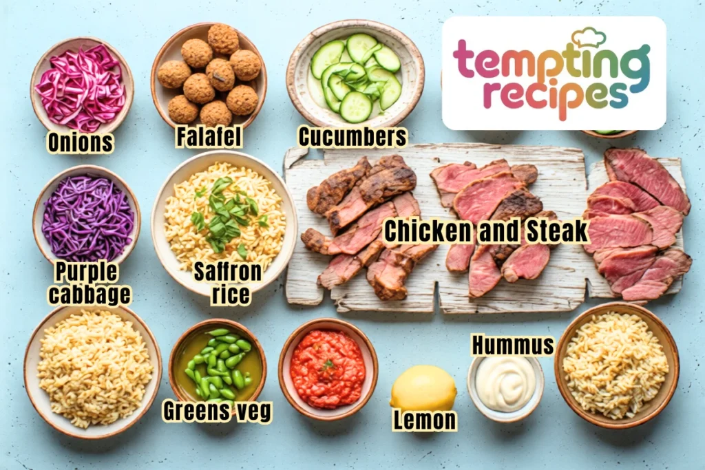 In this recipe, you’ll whip up a bold harissa marinade, cook fluffy saffron rice, sear the steak and chicken to perfection, and bake crispy falafel. It serves four, so it’s great for family meals or meal prep. Each bite mixes spice, crunch, and freshness in the best way.